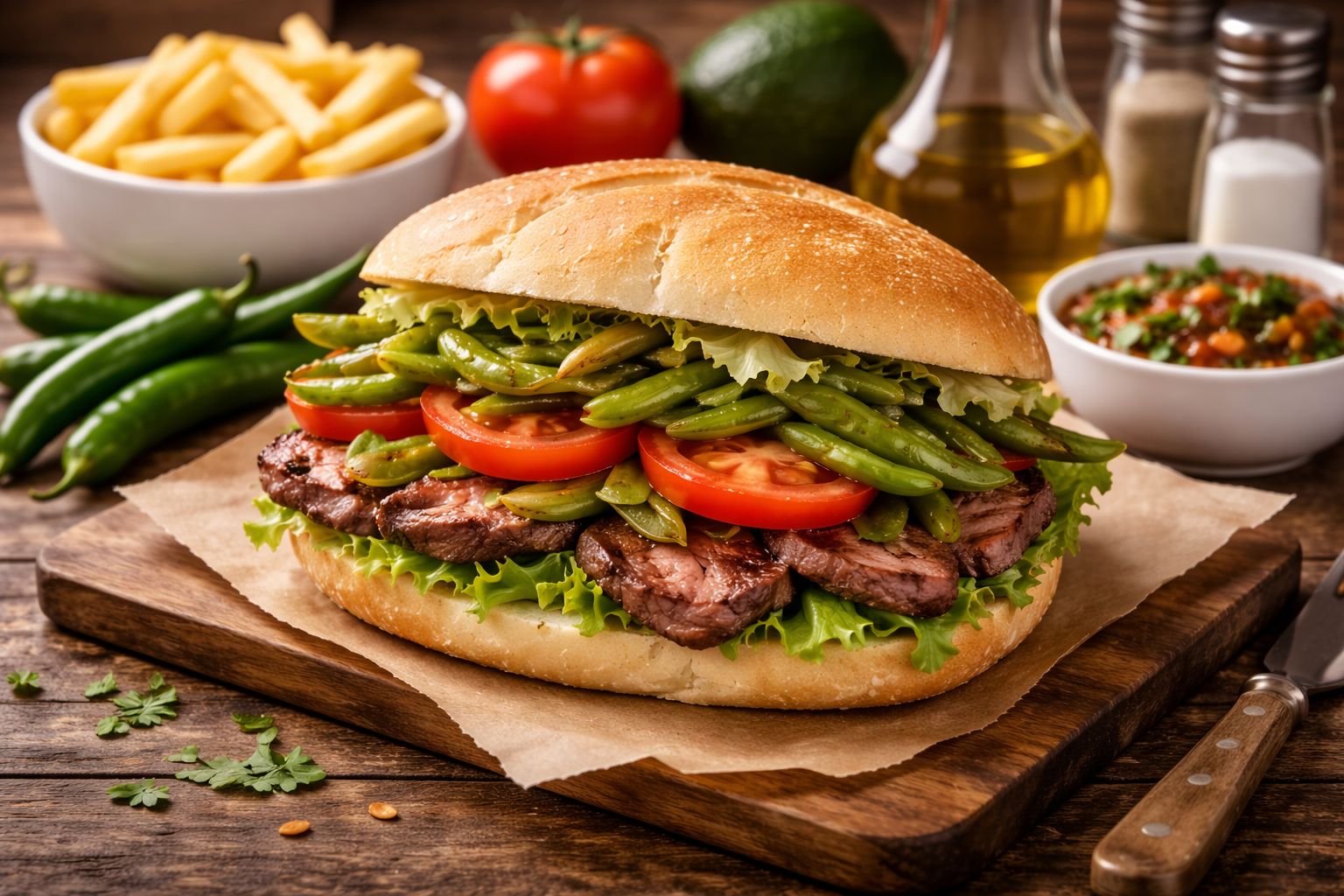 El Chacarero es un ícono de la gastronomía chilena, reconocido por su combinación única de ingredientes frescos y su preparación simple pero llena de carácter. Este sándwich se elabora con carne frita a la plancha, ají verde picado, rodajas de tomate, porotos verdes cocidos fríos y, de forma opcional, mayonesa. Originario de Santiago, se distingue por el uso de porotos verdes y ají picado, elementos que le otorgan un sello inconfundible frente a otros churrascos, convirtiéndolo en un símbolo de la comida urbana chilena.