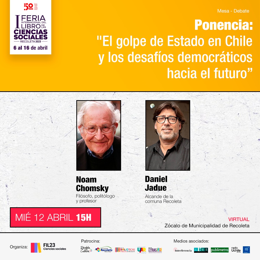 El lingüista estadounidense Noam Chomsky se presentará de forma telemática en la 1a Feria Internacional del Libro y las Ciencias Sociales de Recoleta junto al alcalde Daniel Jadue, repasando los 50 años a partir del golpe de estado de 1973 y los desafíos para la defensa de la democracia en el actual escenario global.