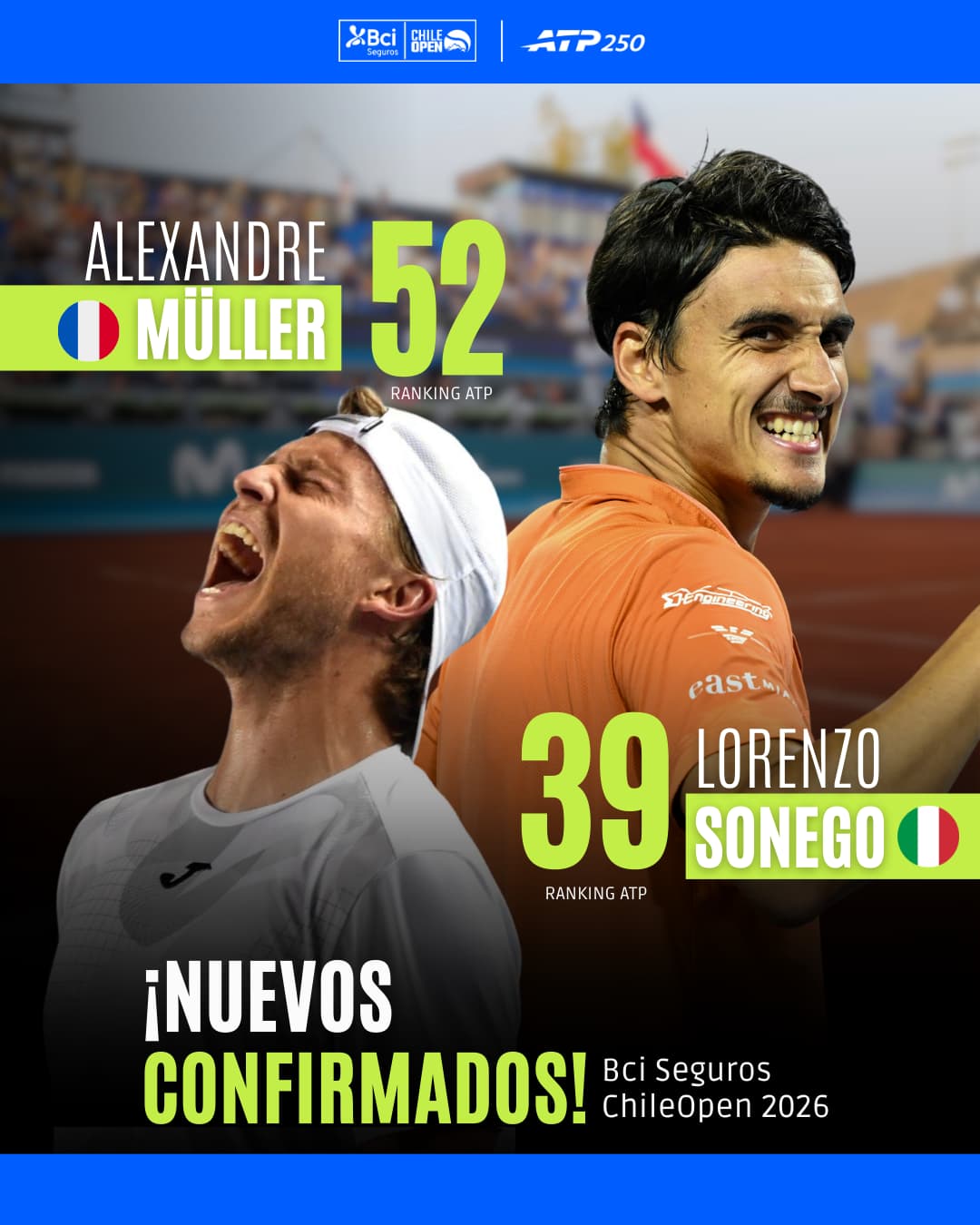 Además, hace unos días se integraron también al Chile Open 2026 el italiano Lorenzo Sonego (39° ATP) y el francés Alexandre Müller (52° ATP), campenato que se disputará del 21 de febrero al 1 de marzo, en el Club Deportivo San Carlos de Apoquindo.