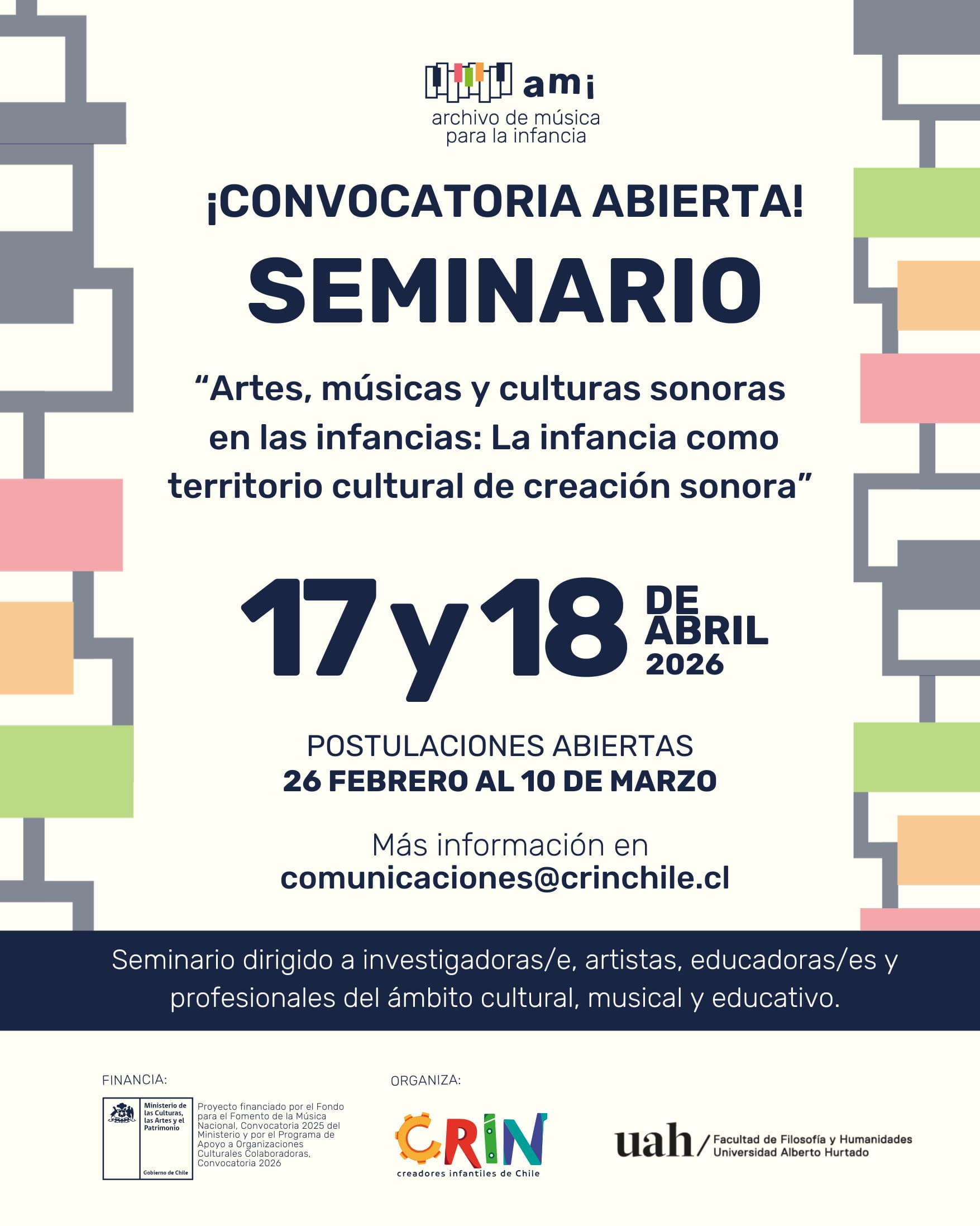 CRIN Chile, a través de su Archivo de Música para la Infancia (AMI), junto al Instituto de Música de la Universidad Alberto Hurtado (UAH), abrieron la convocatoria para participar en el seminario académico “Artes, músicas y culturas sonoras en las infancias: la infancia como territorio cultural de creación sonora”, encuentro que se realizará los días 17 y 18 de abril de 2026 en Santiago y que invita a investigadores, artistas y educadores a presentar ponencias que cuestionen la mirada tradicional de la música infantil y posicionen a la infancia como un espacio de creación, identidad cultural y patrimonio vivo.