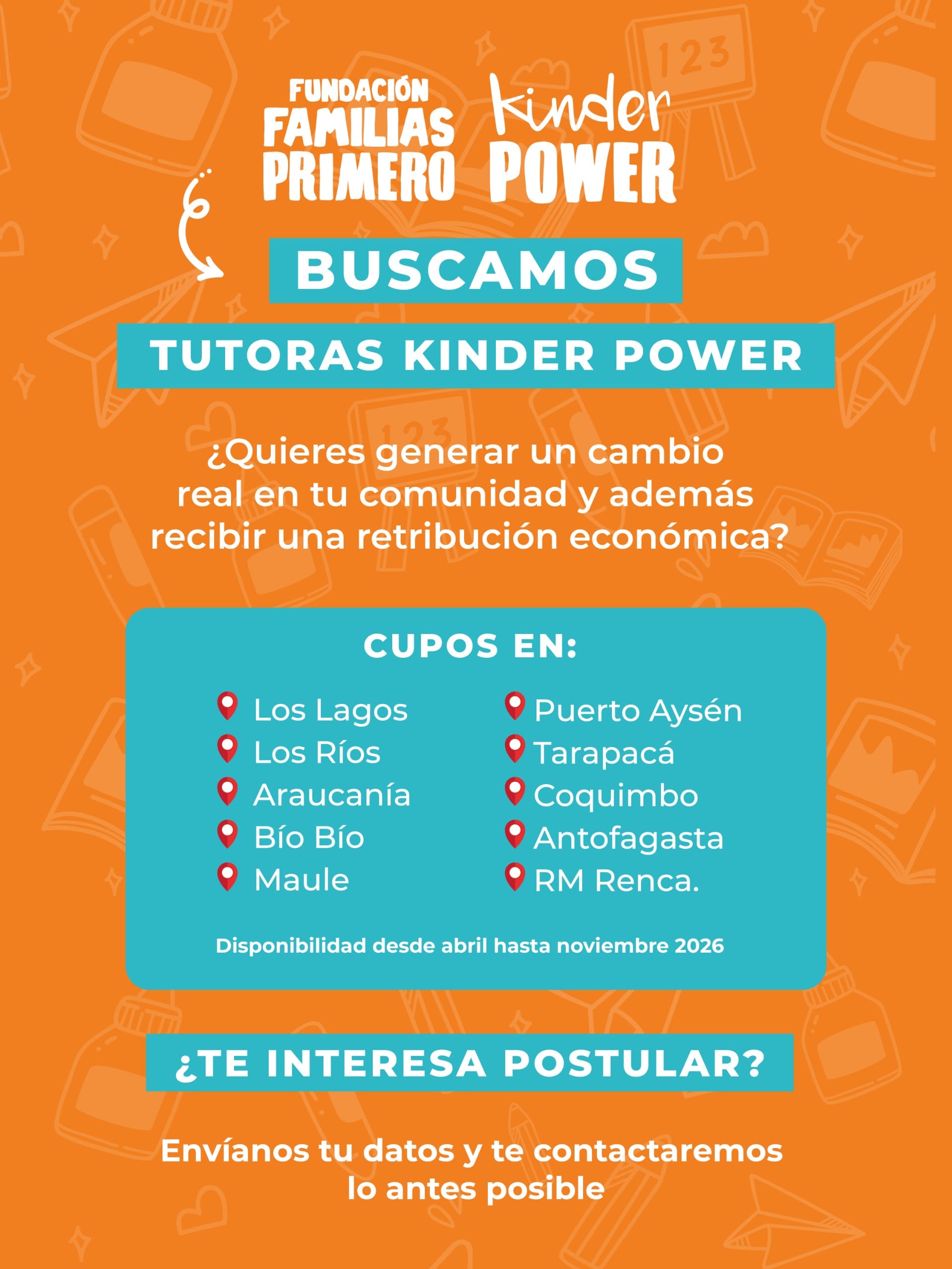 Las personas interesadas pueden postular o solicitar más información a través del formulario disponible en https://bit.ly/4bUCHDm o mediante el Instagram @familiasprimero, utilizando el enlace de la biografía e indicando su comuna y disponibilidad.