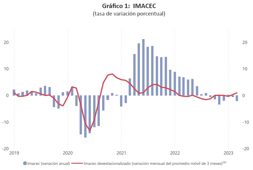 De acuerdo con la información preliminar, el Imacec de marzo de 2023 cayó 2,1% en comparación con igual mes del año anterior (Gráfico 1). La serie desestacionalizada disminuyó 0,1% respecto del mes precedente y cayó 1,9% en doce meses . El mes registró la misma cantidad de días hábiles que marzo de 2022.