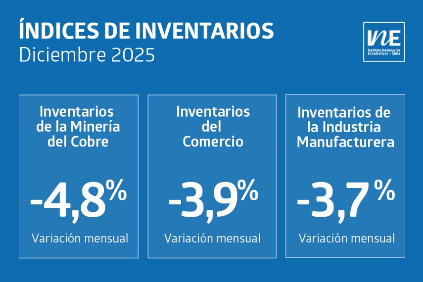 Los resultados completos de los Índices de Inventarios de la Minería del Cobre, del Comercio y de la Industria Manufacturera correspondientes a diciembre de 2025 están disponibles en www.ine.gob.cl.