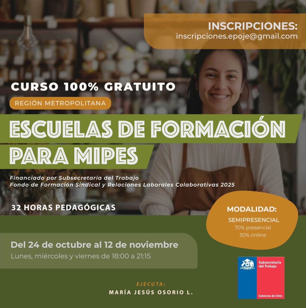 El Ministerio del Trabajo y Previsión Social, invita a trabajadores/as, emprendedores/as y dueños/as de MIPES interesados/as en fortalecer sus conocimientos y herramientas para impulsar sus negocios, a ser parte del proyecto gratuito Escuelas de Formación para MIPES 2025, desarrollado por María Jesús Osorio en la Región Metropolitana.