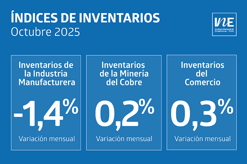 Los resultados completos de los Índices de Inventarios de la industria manufacturera, minería del cobre y comercio, correspondientes a octubre de 2025, se encuentran disponibles en el sitio web del Instituto Nacional de Estadísticas (INE).