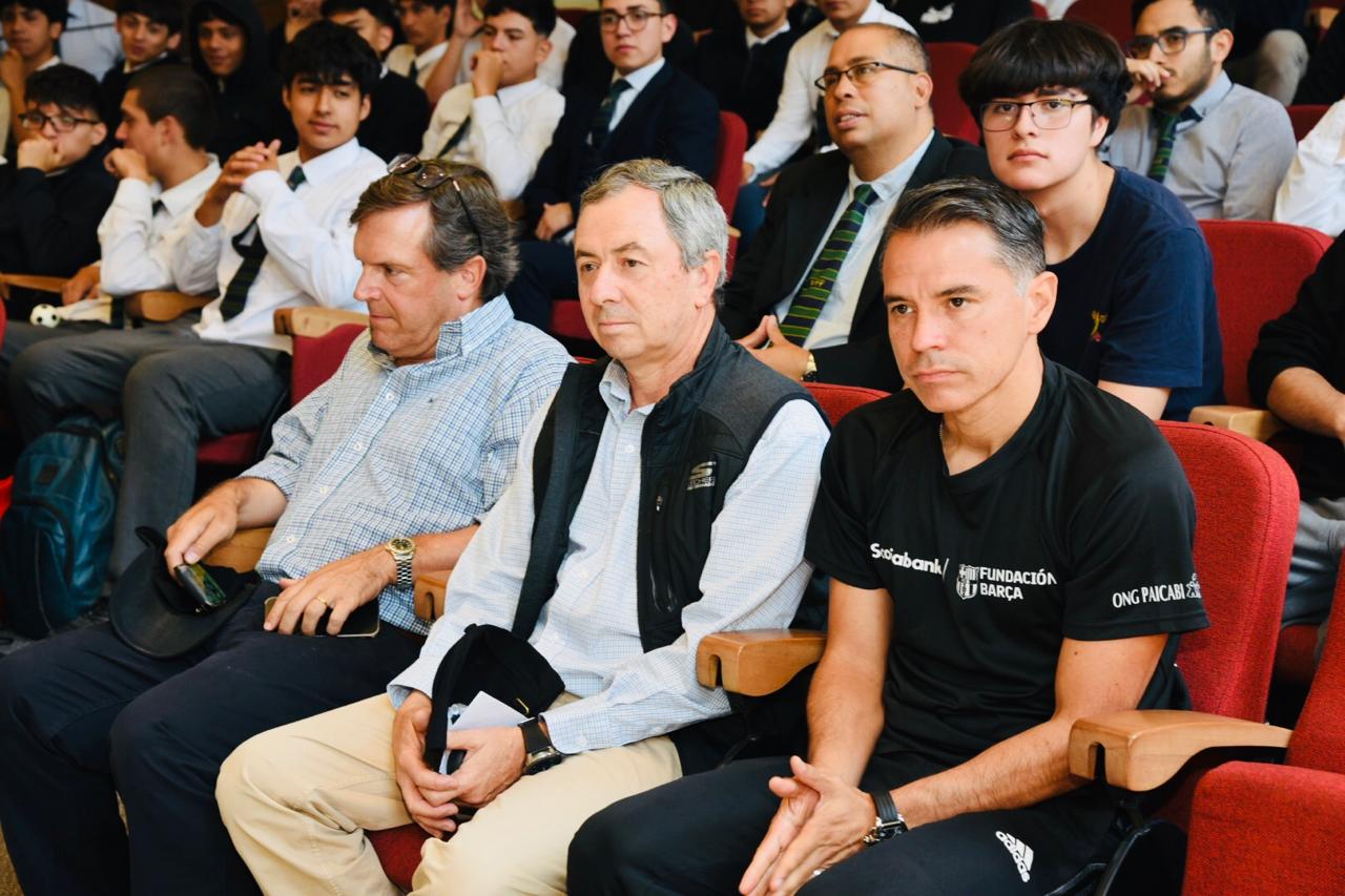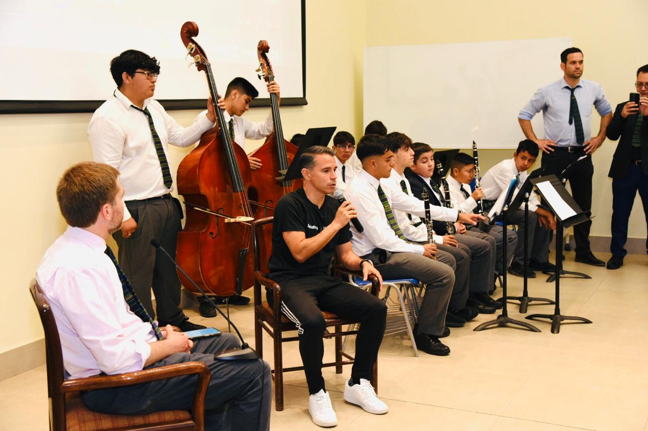 Saviola encabezó una charla con estudiantes en el auditorio del establecimiento. Allí, los alumnos le preguntaron sobre su carrera futbolística, su paso por clubes internacionales, su experiencia en mundiales y los desafíos del alto rendimiento.
