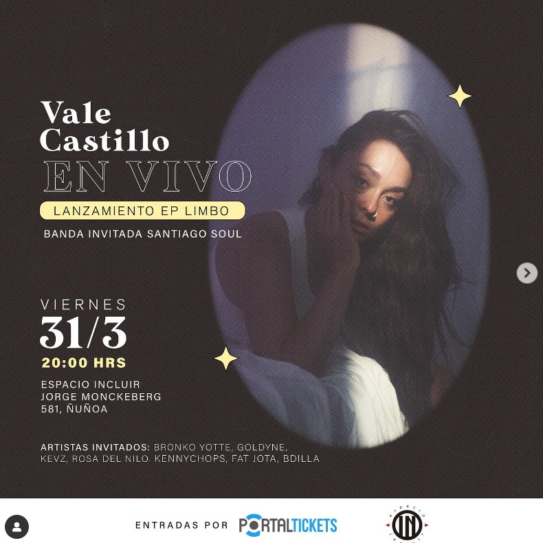 Hace unas semanas, Vale Castillo informó en sus redes sociales de su primer concierto en la capital, a realizarse en Espacio Incluir (Jorge Monckeberg 581, Ñuñoa) el próximo viernes 31 de marzo, desde las 20 horas, donde lanzará el EP Limbo y tendrá como banda invitada a Santiago Soul. Venta de entradas a través del sistema portaldisc.com.