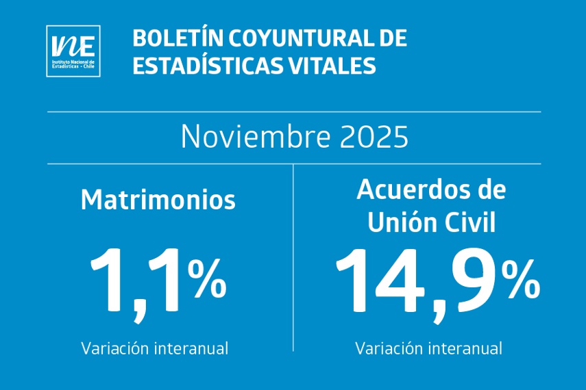 En noviembre de 2025, los matrimonios, los Acuerdos de Unión Civil (AUC) y las defunciones registraron aumentos interanuales en Chile, mientras que los nacimientos presentaron una leve caída de 0,7%, según informó el Instituto Nacional de Estadísticas (INE) en su Boletín Coyuntural de Estadísticas Vitales.