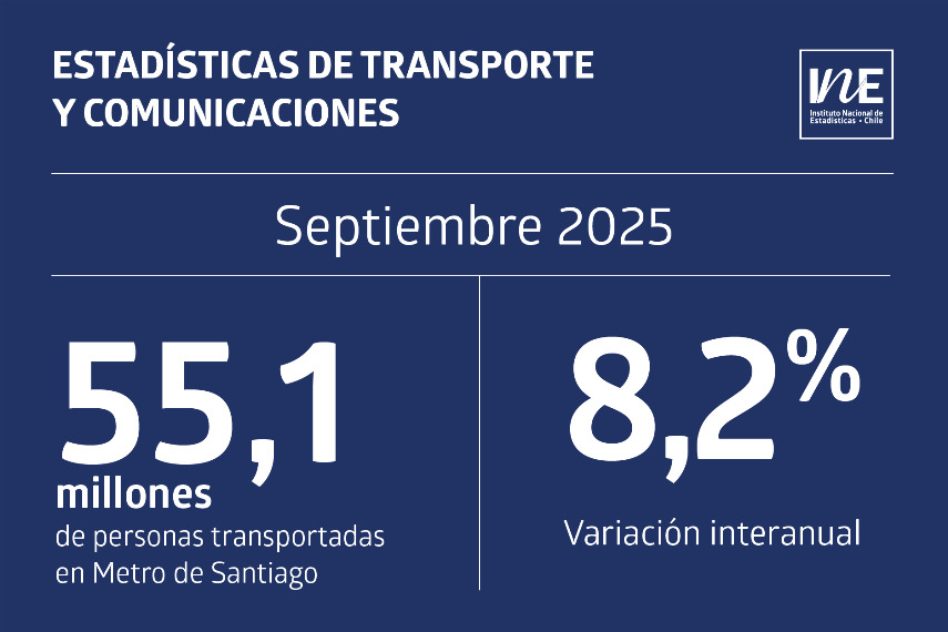 El Metro de Santiago transportó 55,1 millones de personas en septiembre de 2025, lo que representa un aumento interanual de 8,2%, según el Boletín de Transporte y Comunicaciones publicado por el Instituto Nacional de Estadísticas (INE). La cifra confirma la recuperación sostenida del transporte público capitalino, impulsada por una mayor demanda de movilidad en la Región Metropolitana.