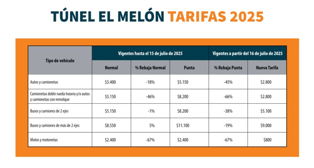 La ministra de Obras Públicas, Jessica López, anunció que VíasChile, operadora de la concesión de la Ruta 5 Tramo Santiago-Los Vilos, integró a partir del 1 de julio de 2025, Túnel El Melón como parte de Autopista Nueva Aconcagua, lo que considera la aplicación desde del miércoles 16 de julio, de un nuevo esquema de rebaja tarifaria en dicho peaje, beneficiando directamente a los cerca de 200 mil vehículos mensuales que transitan por este sector.