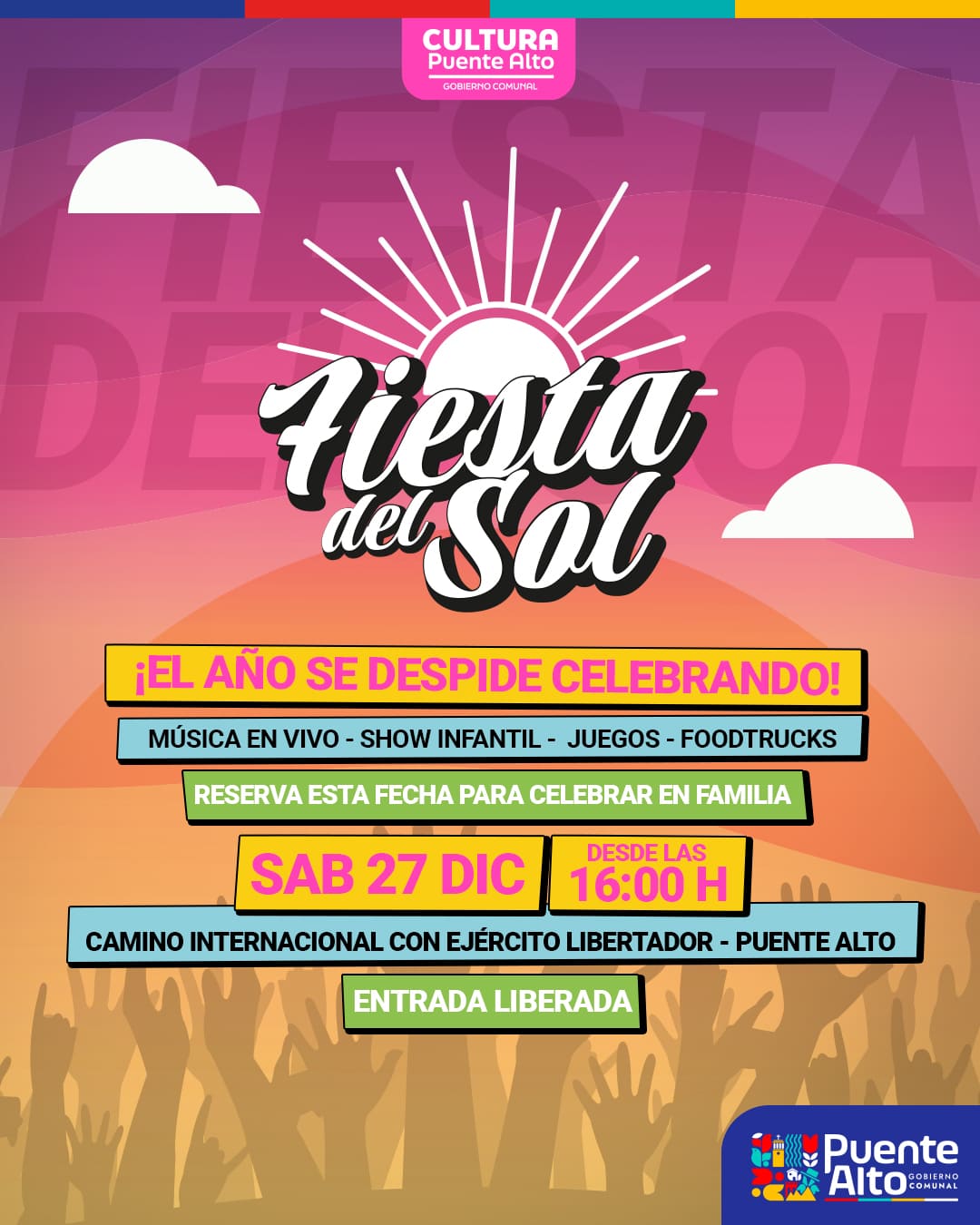 Puente Alto recibirá el verano con La Fiesta del Sol, un gran evento cultural gratuito y al aire libre que se desarrollará el sábado 27 de diciembre, desde las 16:00 horas, en el sector de Camino Internacional con Ejército Libertador. La iniciativa busca consolidar el espacio público como un lugar de encuentro, convivencia y celebración comunitaria.