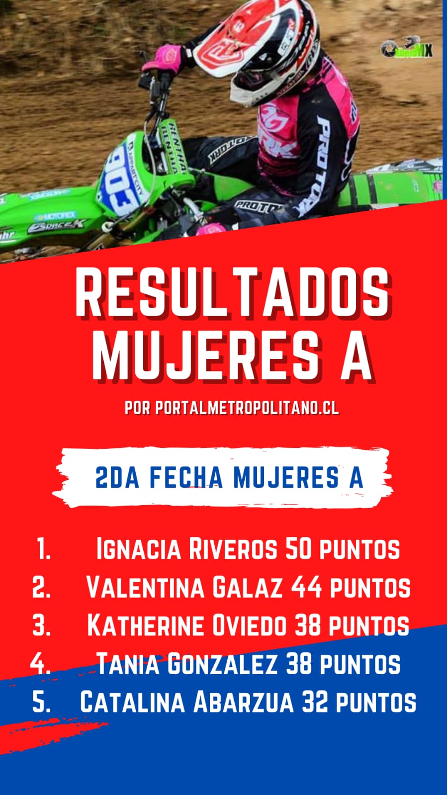 La serie femenina tuvo un nombre que dominó la jornada. Se trata de Ignacia Riveros, la actual monarca de la categoría Mujeres, quien sumó sus primeros puntos de la temporada y se quedó con las dos mangas, con lo que se llevó puntaje perfecto de 50 puntos.