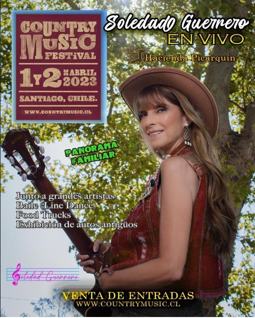 Con más de 30 años de trayectoria musical, la artista Soledad Guerrero una vez más muestra su versatilidad profesional, donde ha sido convocada a presentar su repertorio en el “Country Music Festival”, en Hacienda Picarquín, ubicado en la comuna de San Francisco de Mostazal.