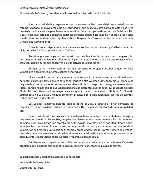 “Estamos viviendo un grave problema de seguridad, al que desde nuestro punto de vista no se le ha puesto la debida atención para buscar una solución. Somos un grupo de vecinos de Peñalolén Alto y Las Pircas que estamos expuestos todas las semanas desde hace más de cuatro meses a las fiestas clandestinas que se desarrollan regularmente en Diagonal Las Torres en el sector del acceso de la Universidad Adolfo Ibáñez”, detalla la misiva.