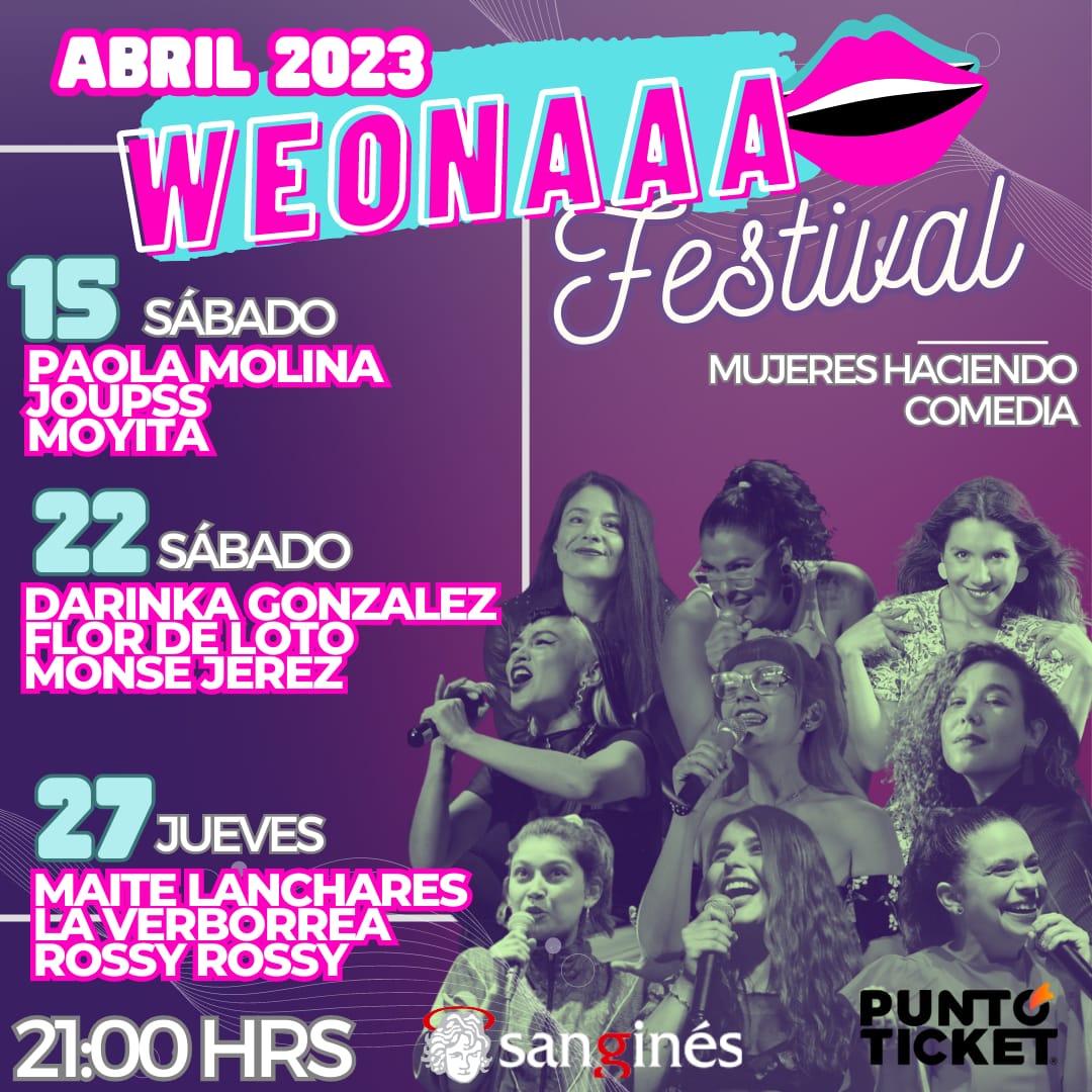 Durante los días 15, 22 y 27 de abril regresa el revolucionario e histórico festival “Weonaaa Festival: Mujeres haciendo comedia”, que en su primera versión reunió a más de 20 comediantas durante dos noches de enero. Esta vez se suman nuevas standuperas de larga trayectoria nacional.